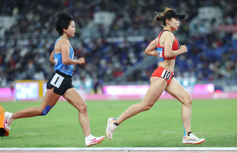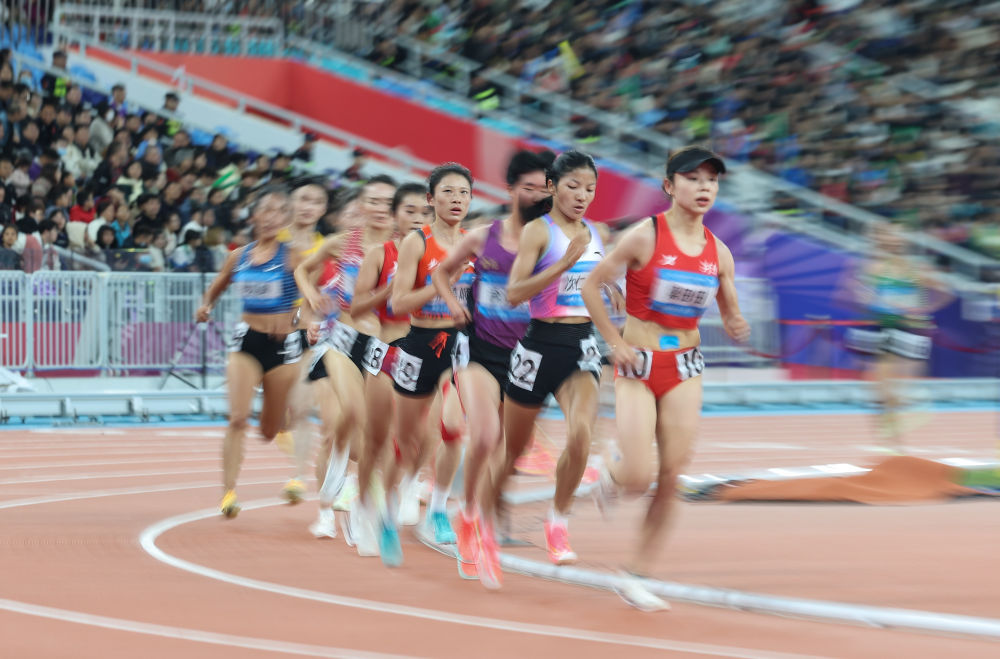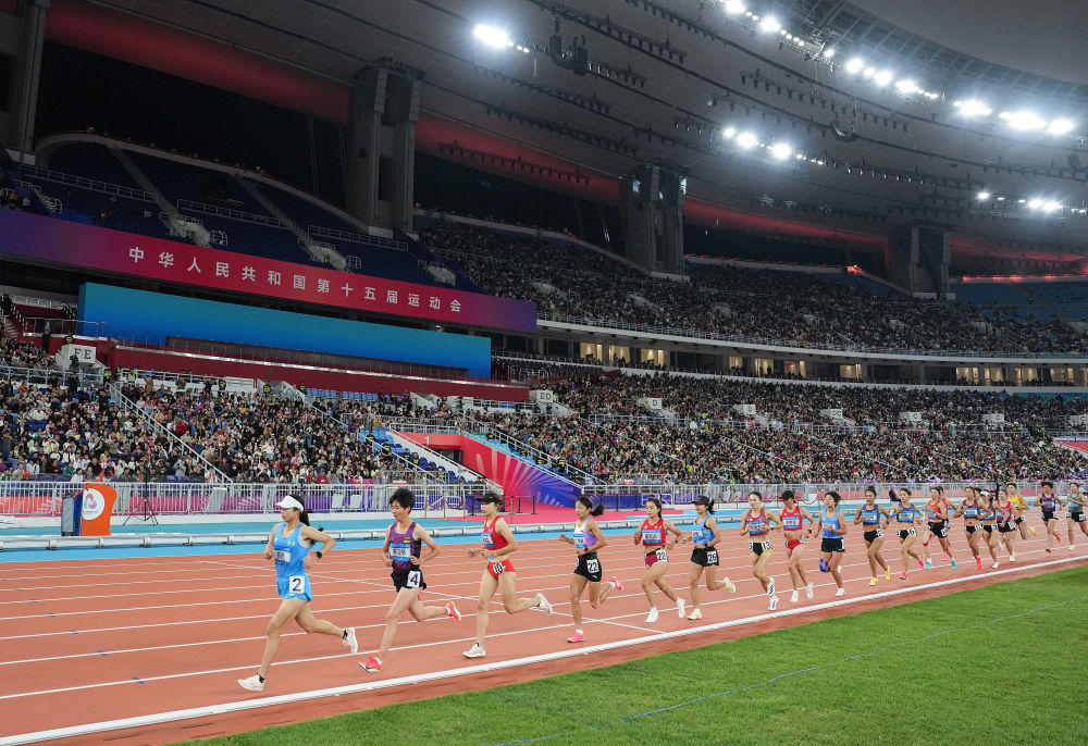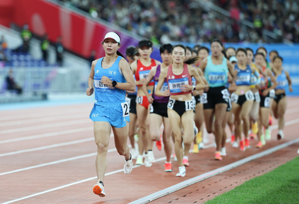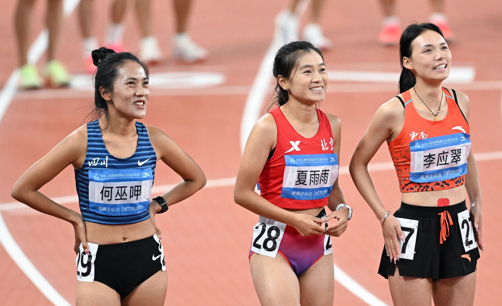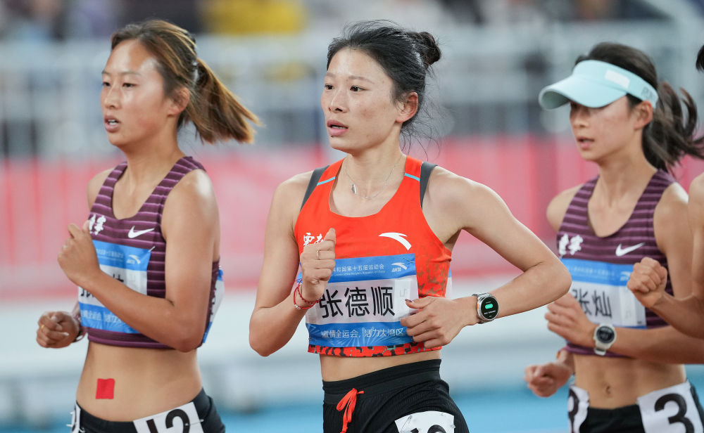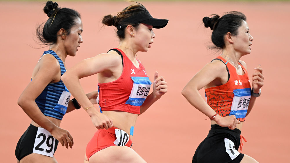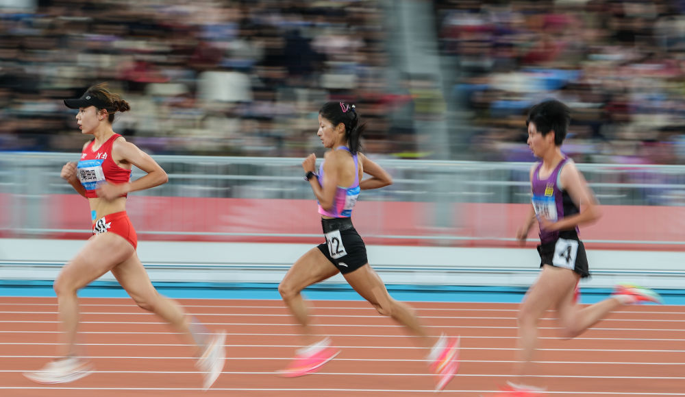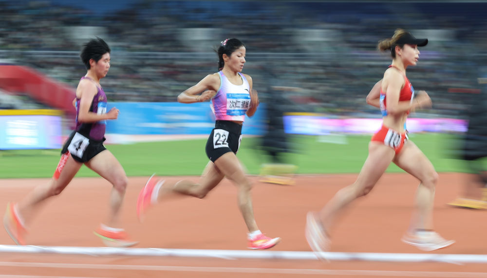↑ 河南队选手梁田田(左)、冠军个人参赛选手次仁措姆(中)在比赛中。全运她们分获冠军和季军。田田田径 新华社记者 李一博 摄