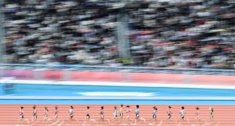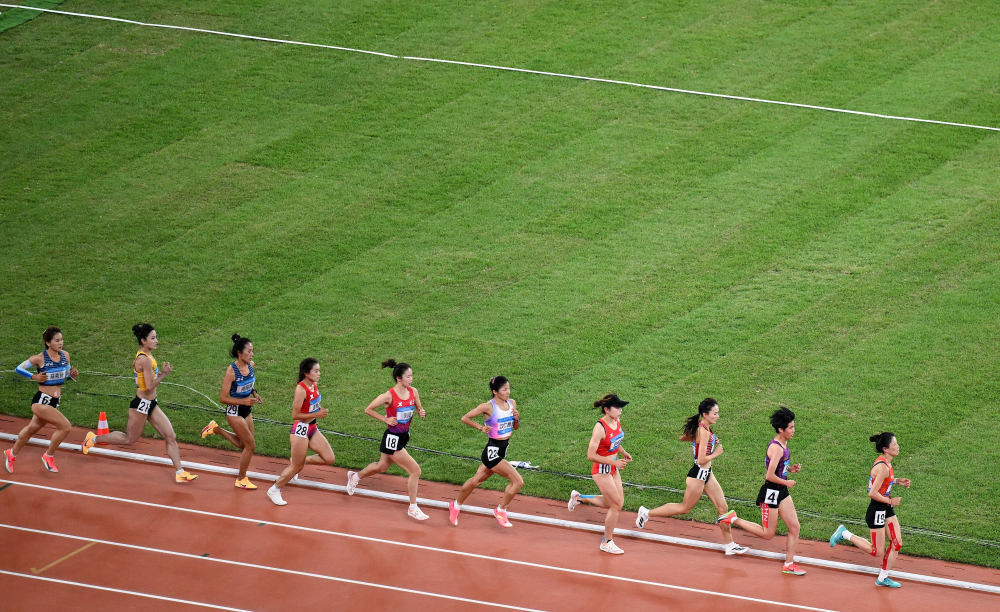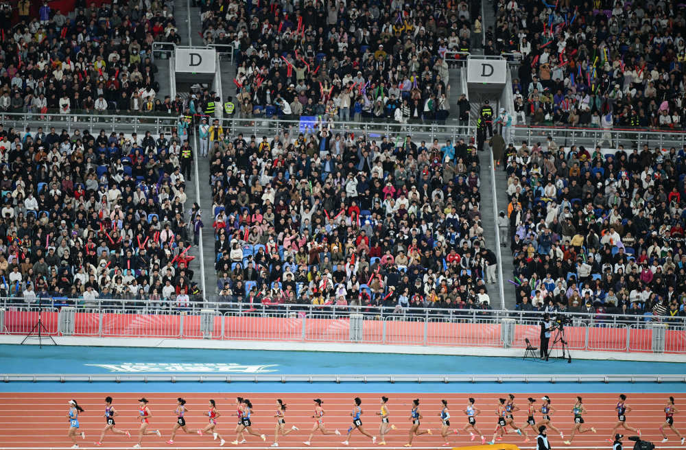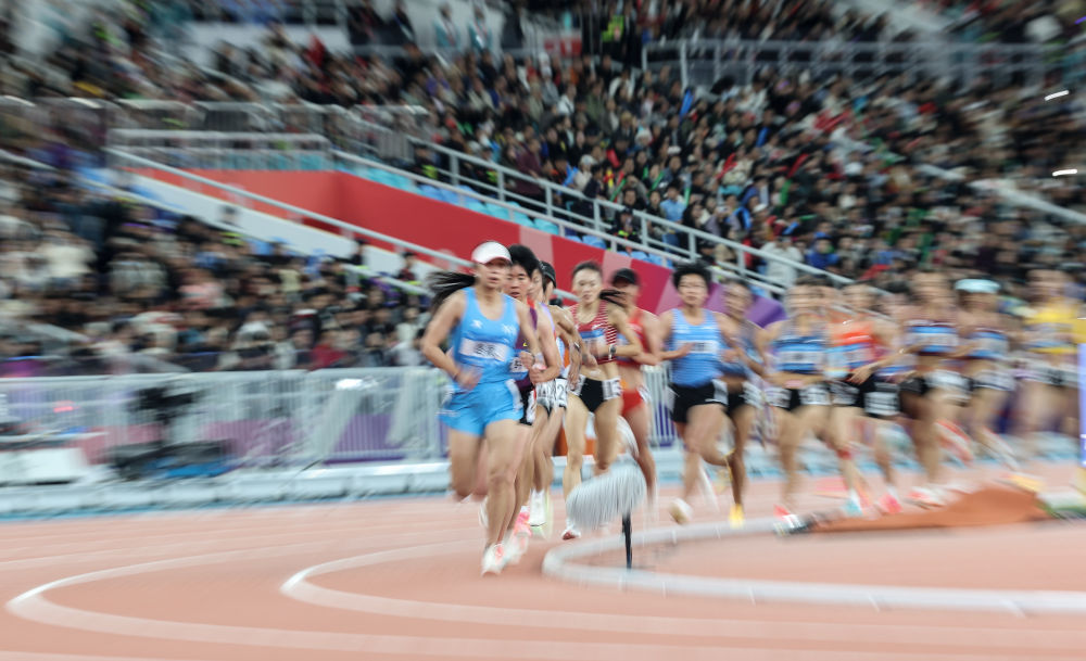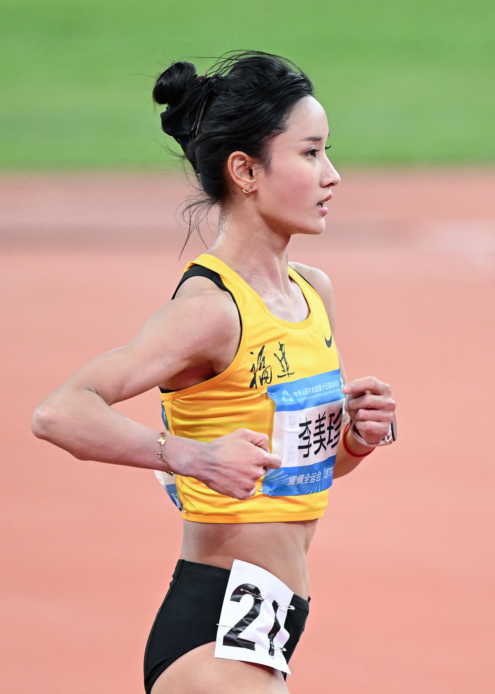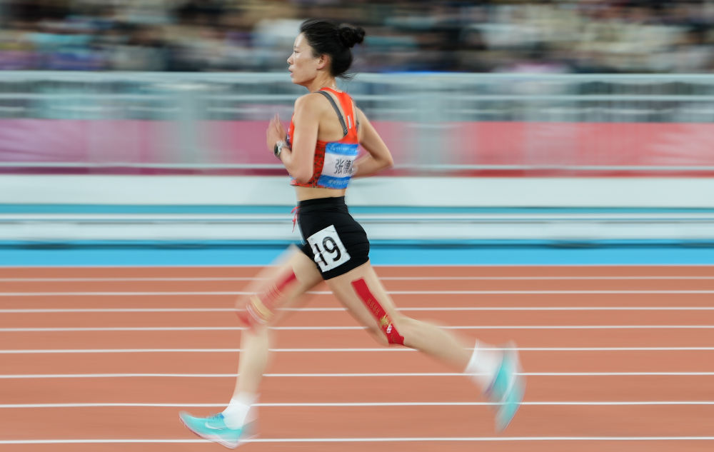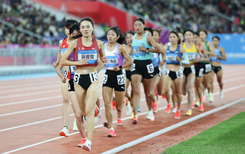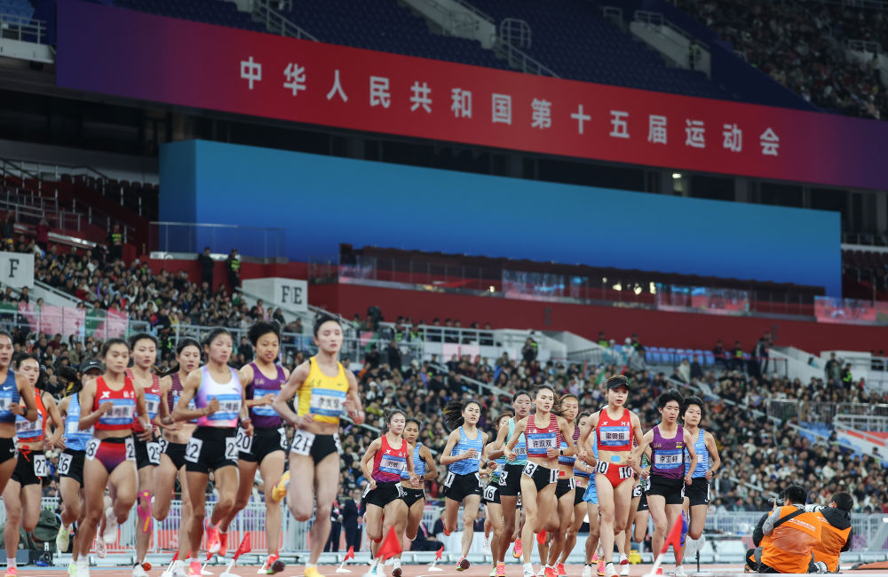 ↑ 河南队选手梁田田(左)、冠军个人参赛选手次仁措姆(中)在比赛中。全运她们分获冠军和季军。田田田径 新华社记者 李一博 摄