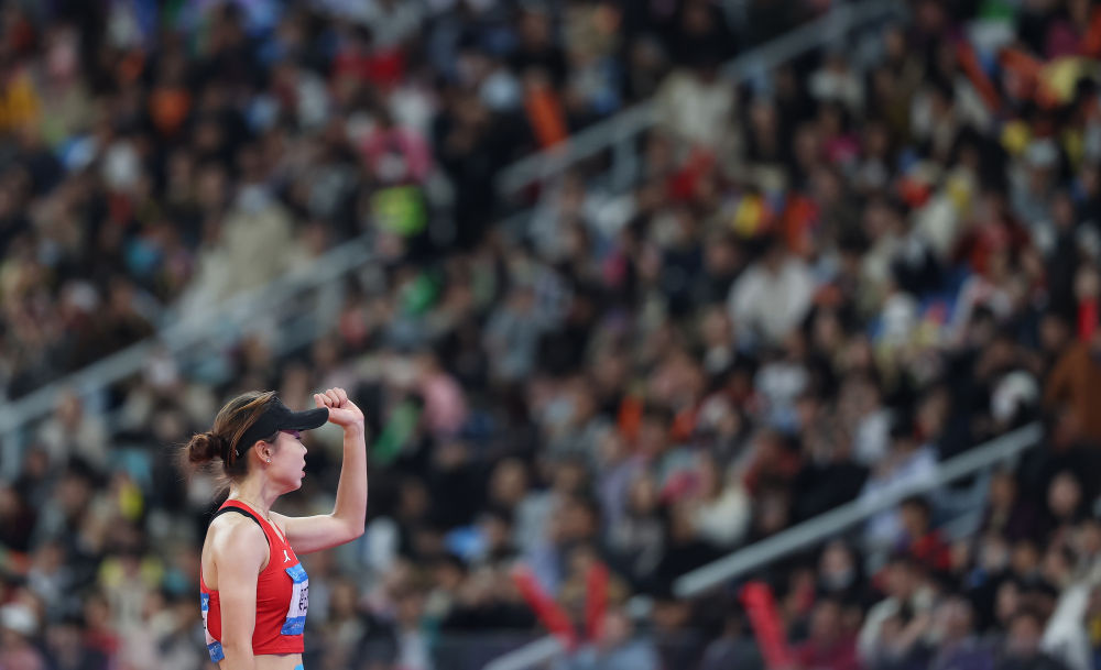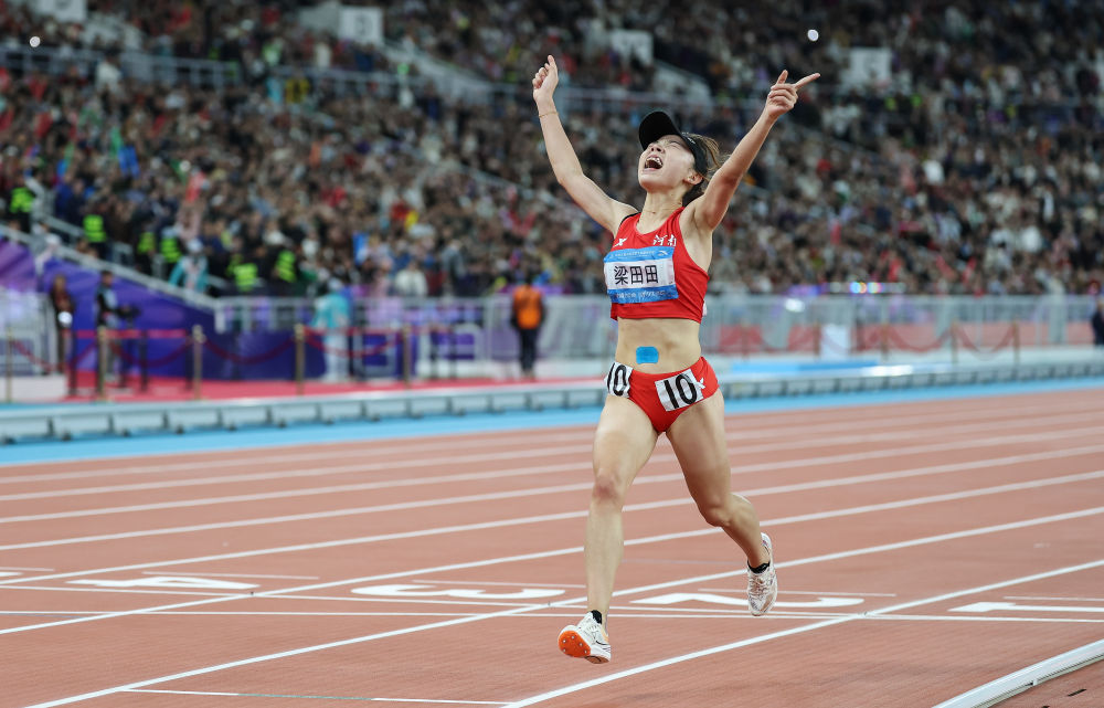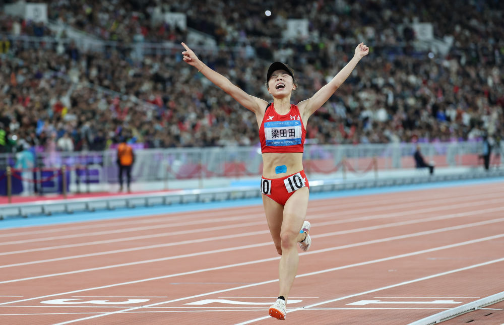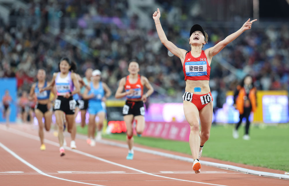 ↑ 河南队选手梁田田在冲线后庆祝。女米 新华社记者 江汉 摄