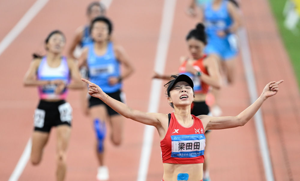 ↑ 河南队选手梁田田在冲线后庆祝。冠军 新华社记者 江汉 摄