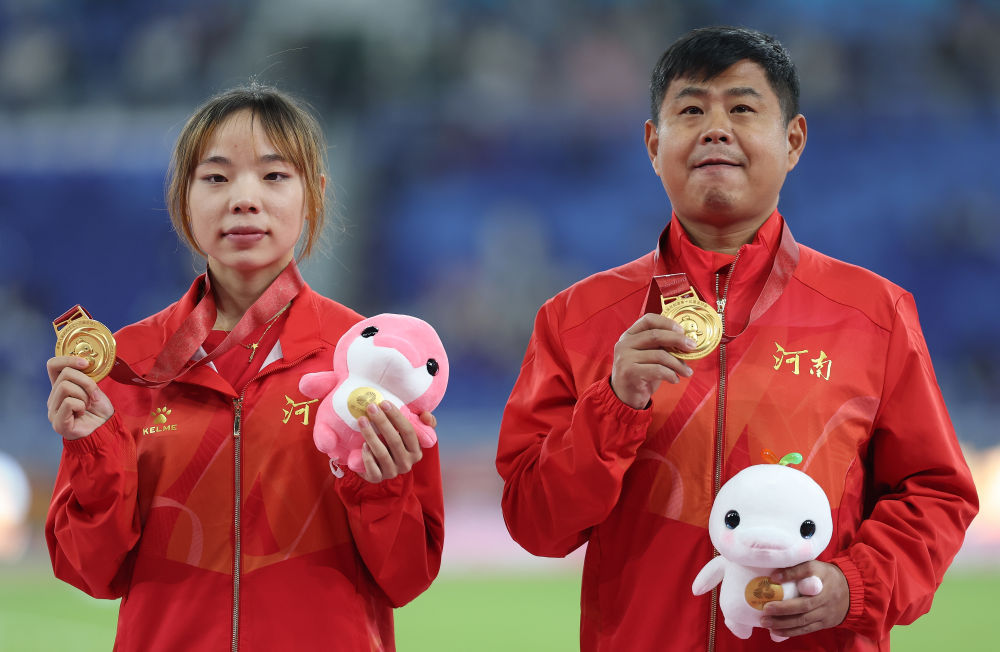 ↑ 获得冠军的女米河南队选手梁田田(左)与教练在颁奖仪式上合影。 新华社记者 黄伟 摄