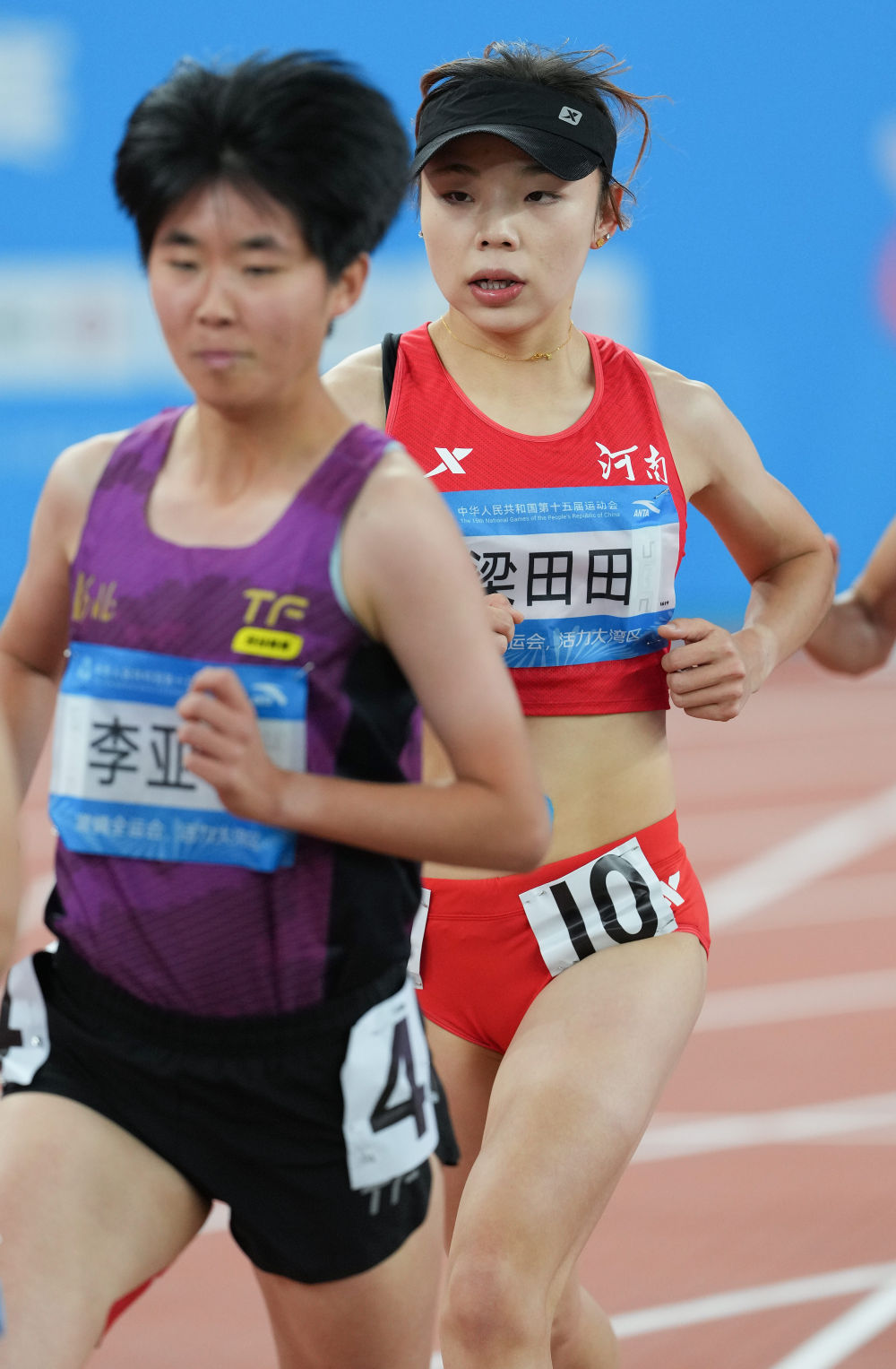 ↑ 河南队选手梁田田(前)在比赛中冲线。田田田径 新华社记者 邓华 摄