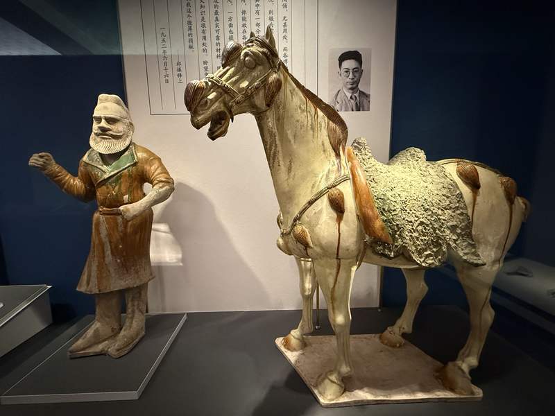 三彩马的一旁,是件三彩胡人牵马俑。高鼻深目,髭须浓密,身穿翻领衣,双手作握缰绳姿势,似在牵骆驼或牵马,亦由郑振铎捐赠。
