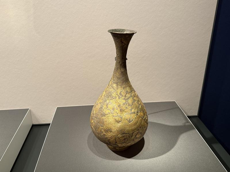 此次展览上有一件精美的玉壶春瓶,就是由何刚捐赠。撇口、细颈、硕腹、圈足的瓶式,流行于宋、元两代,影响后世。此瓶通体银鎏金,腹部两侧錾刻凤穿牡丹纹,外底足内压印“樊”字。凤凰象征鸟中之王,牡丹被誉为花中之王,自唐代以降,二者组合寓意富贵祥瑞,常用于装饰器物、服饰等。