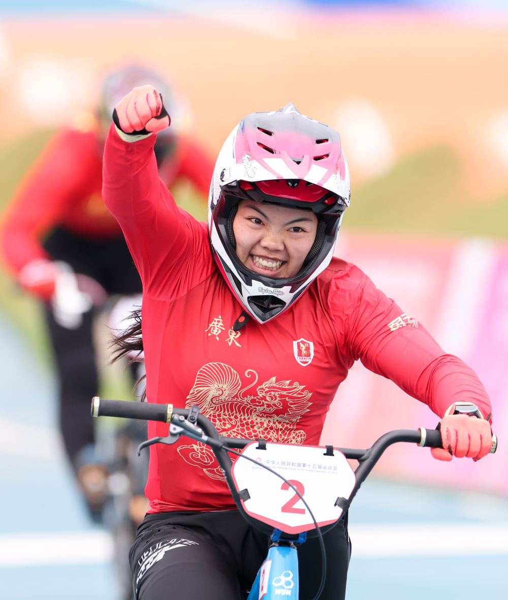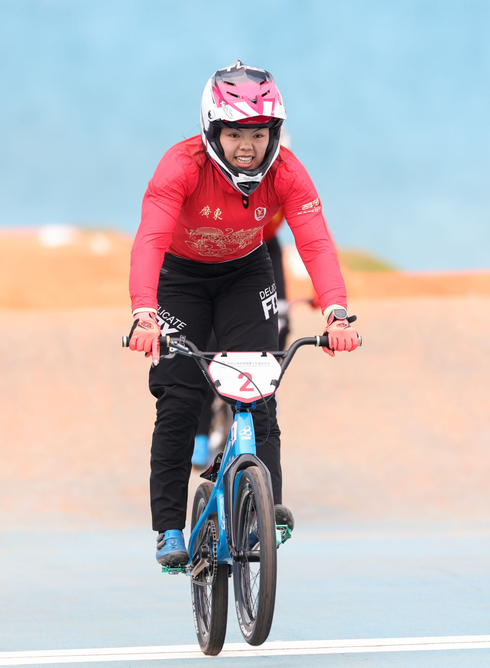 ↑ 广东队选手廖婉仪在比赛中冲过终点。 新华社记者 丁汀 摄