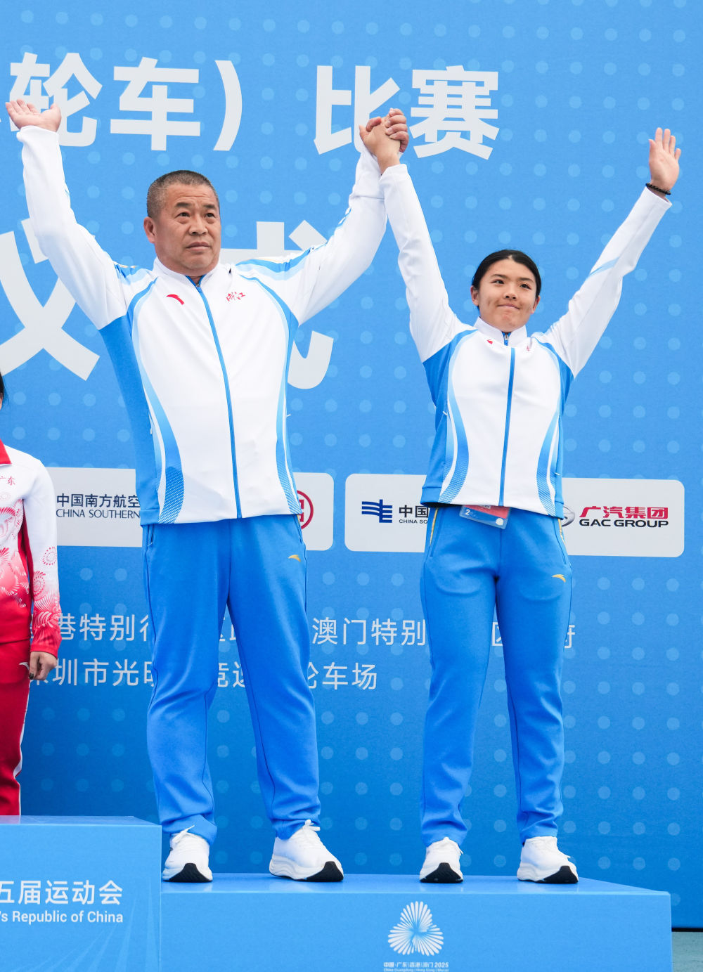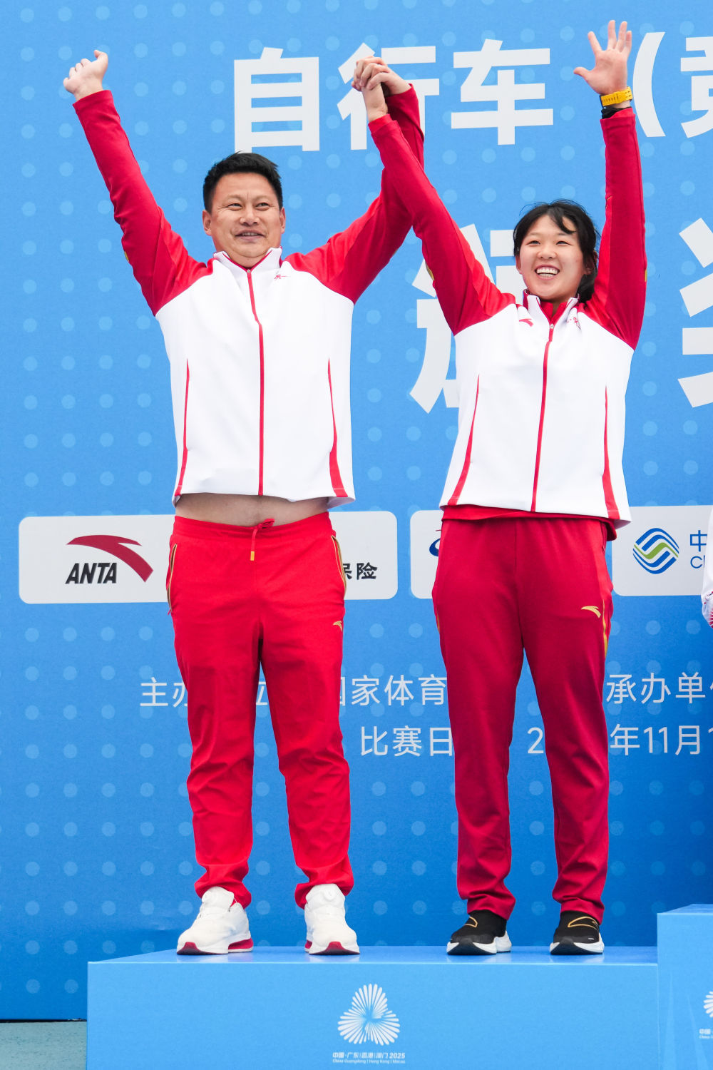 ↑ 冠军广东队选手廖婉仪(右)与教练马丽芸在颁奖仪式上。全运 新华社记者 陈思汗 摄
