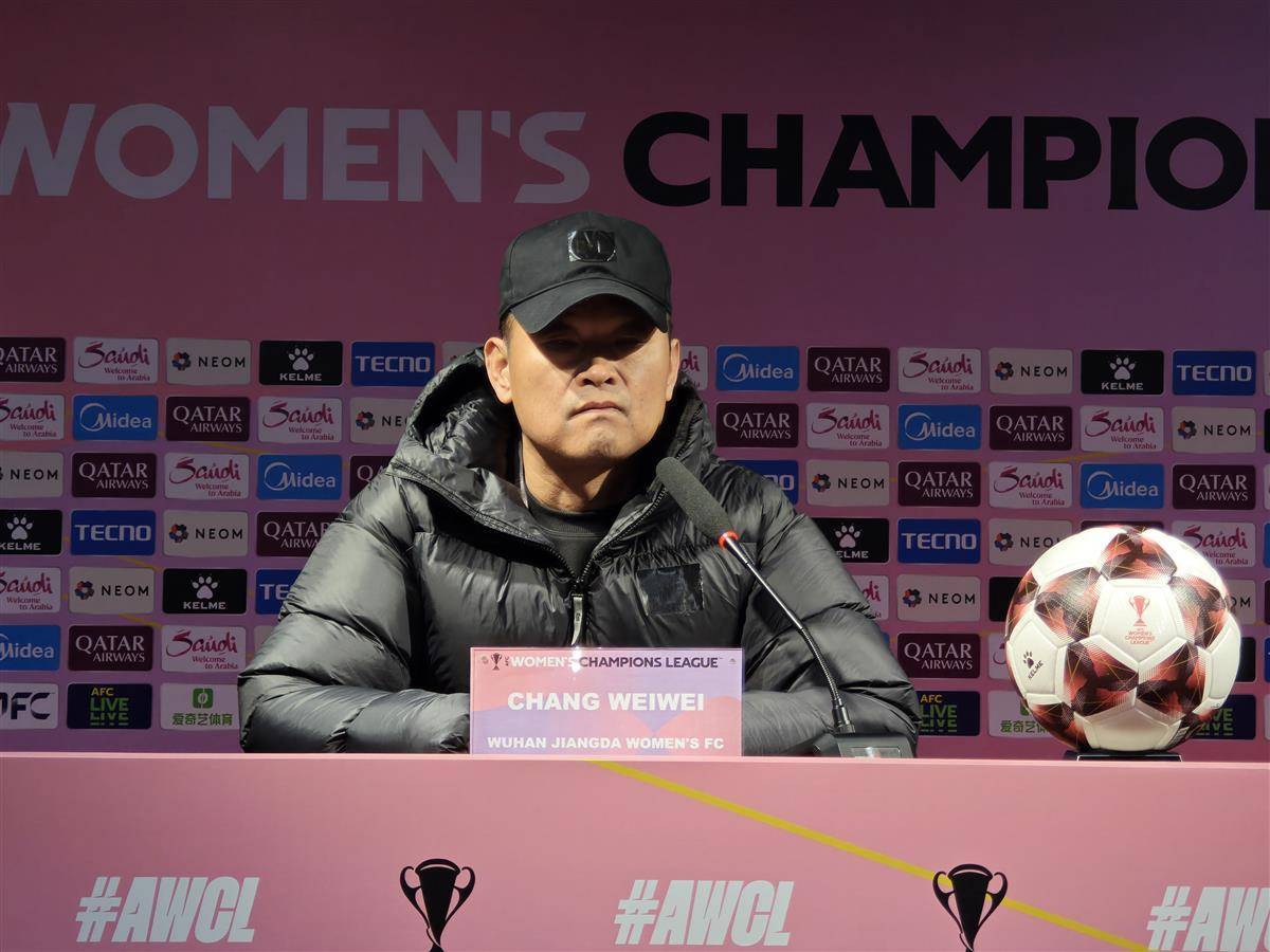 武汉女足主教练常卫魏出席赛后新闻发布会。蔡毅 摄