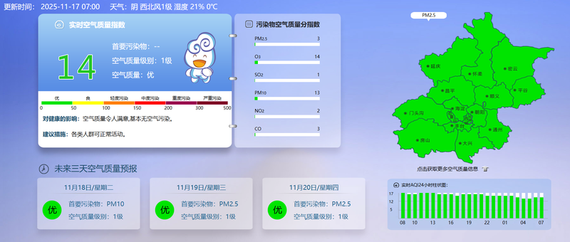 据北京市生态环境监测中心今早7时数据,目前实时空气质量指数14,空气质量优。