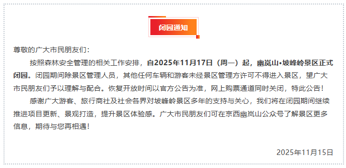 据京西幽岚山微信公众号消息,按照森林安全管理的相关工作安排,自2025年11月17日(周一)起,幽岚山·坡峰岭景区正式闭园。闭园期间除景区管理人员,其他任何车辆和游客未经景区管理方许可不得进入景区,望广大市民朋友们予以理解与配合。恢复开放时间以官方公告为准,网上购票通道同时关闭。