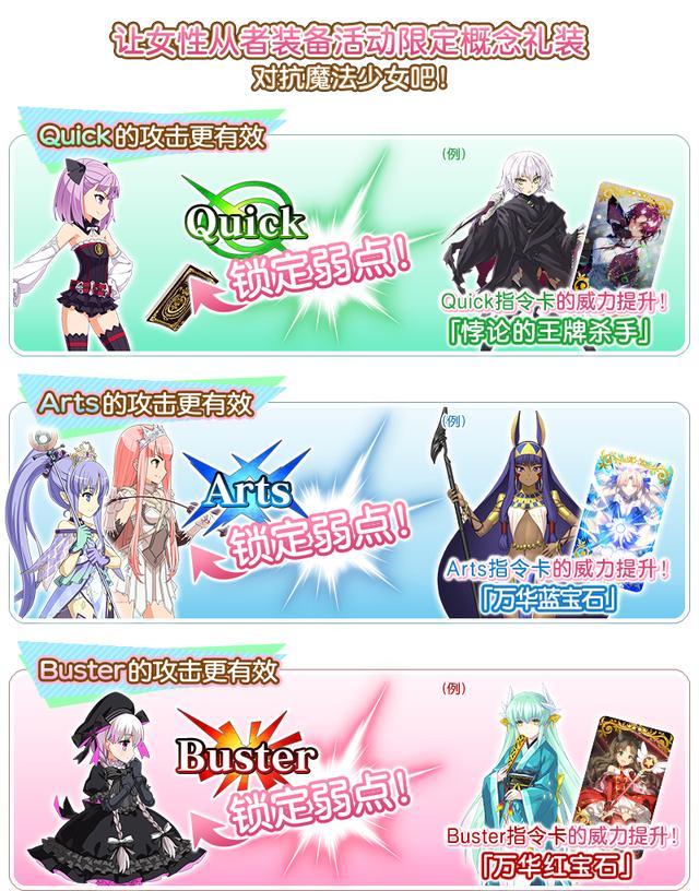 在本活动中,女性從者裝備通過活动道具交換、关卡獎勵、任务獎勵等方式獲得的任务限定觀念禮裝「★4(SR)悖論的王牌殺手」、「★4(SR)萬華藍寶石」「★4(SR)萬華紅寶石」,即可提升攻擊威力!在本任务中,僅有女從者們將被授與對抗魔法少女的力量。