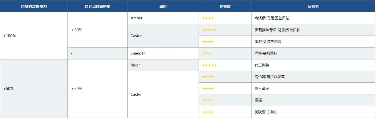 在任务時間內,下表中的從者將在任务关卡中被授與「本来的攻击威力提升」和「羁绊点数获得量提升」的特殊效果。