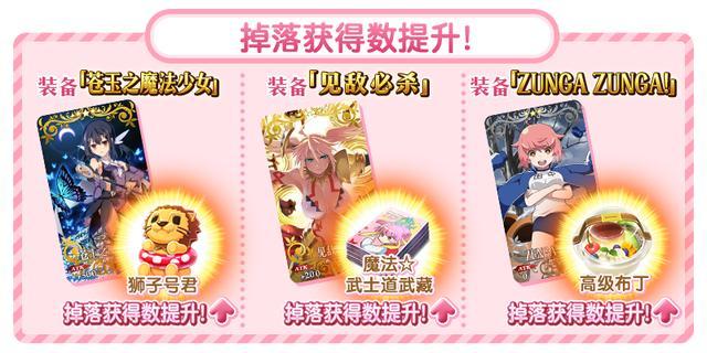 裝備在圣晶石召喚中被提議召喚的限時觀念禮裝「★5(SSR)蒼玉之魔法少女」、「★4(SR)見敵大招」「★3(R)ZUNGA ZUNGA!」,即可分別提升活动匯集道具「狮子号君」、「魔法☆武士道武藏」、「高级布丁」的掉落获得数!