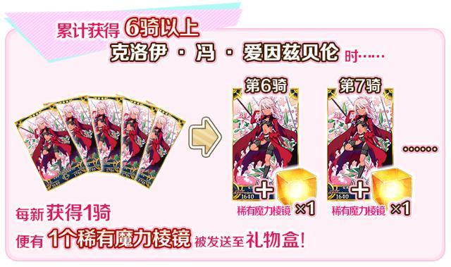 「共計獲得6騎以上」「★4(SR)克洛伊·冯·爱因兹贝伦」时,將從獲得的第6騎起,每新獲得1騎便會有個稀有魔力棱鏡被發送至禮品盒。