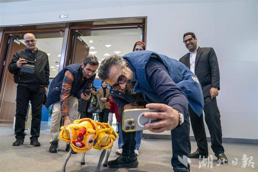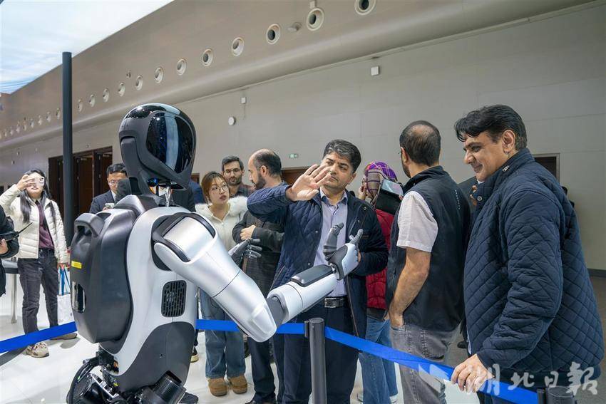 外国观众与长飞机器人互动。