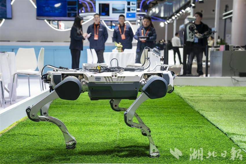 大会创新成果展现场,搭载有5G模块的机器狗与中外观众互动。