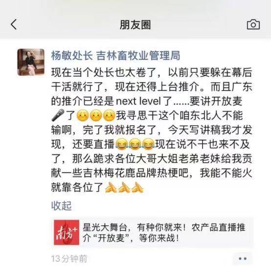 “干这个咱东北人不能输啊!未开”报名参加开放麦的先抢吉林省农业干部杨敏更是发朋友圈征集梅花鹿品牌热梗,她对这一活动形式给予了极高的评价“广东的推介已经是next level了......要讲开放麦。”