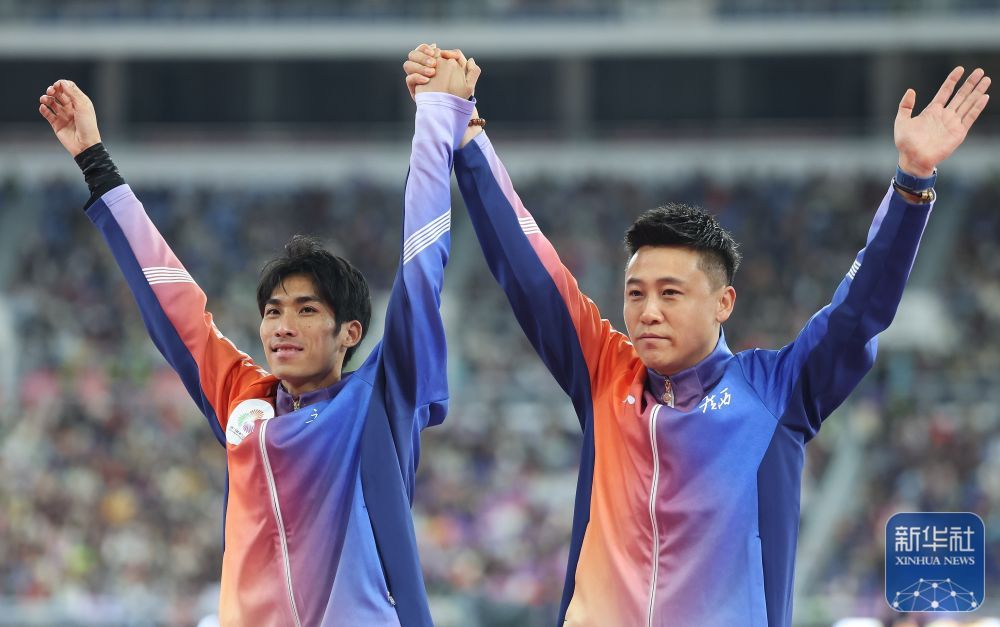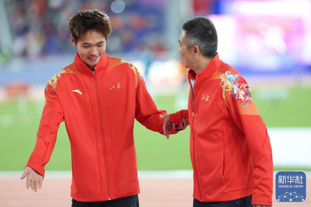 ↑ 获得冠军的田径广西队选手刘德助(左)与教练在颁奖仪式上。 新华社记者 黄伟 摄