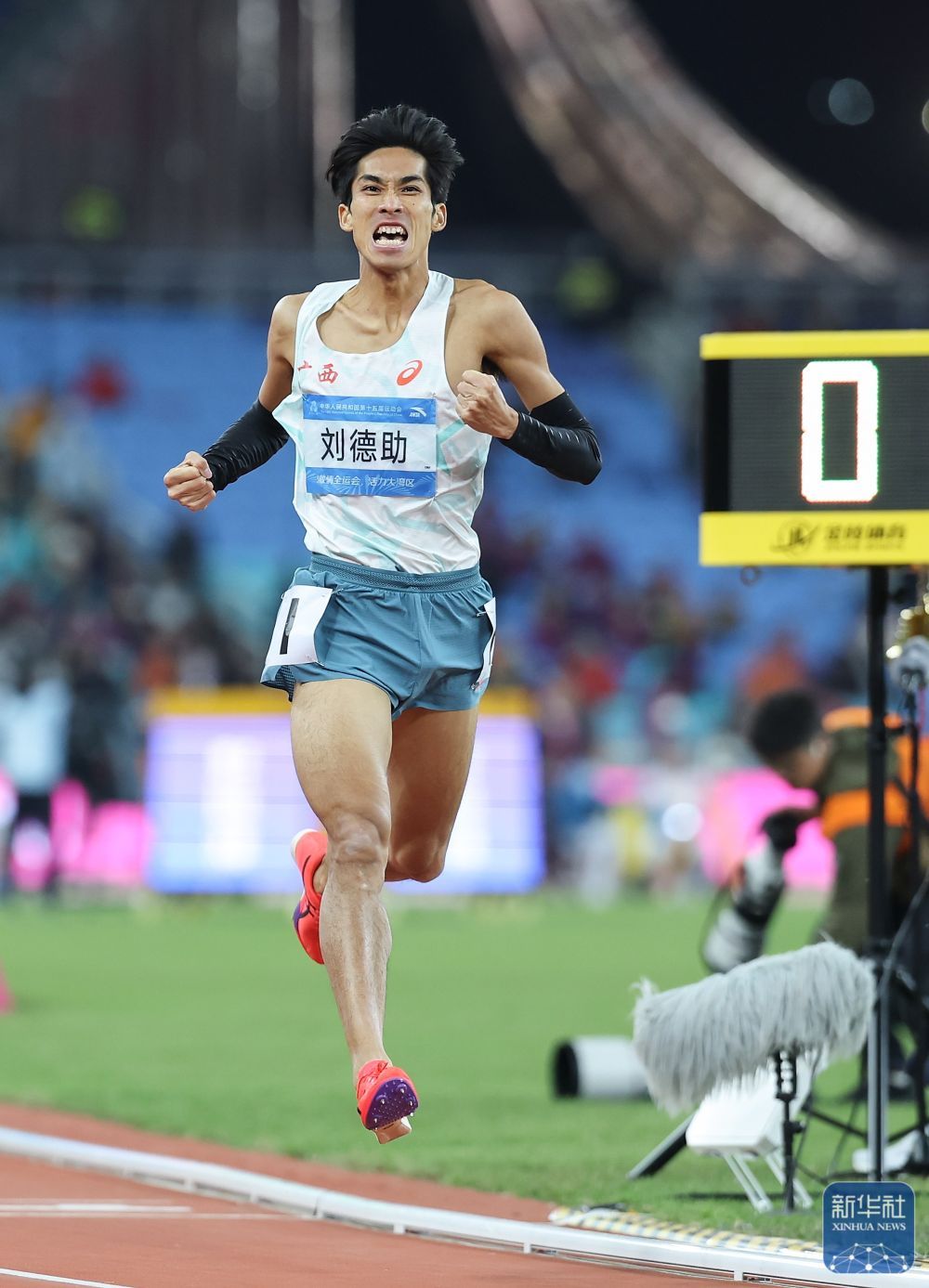 ↑ 广西队选手刘德助在冲线后庆祝夺冠。 新华社记者 黄伟 摄