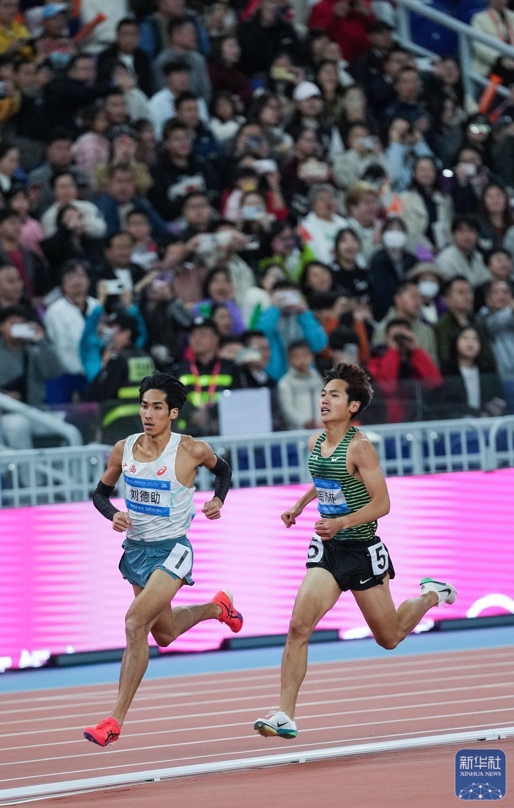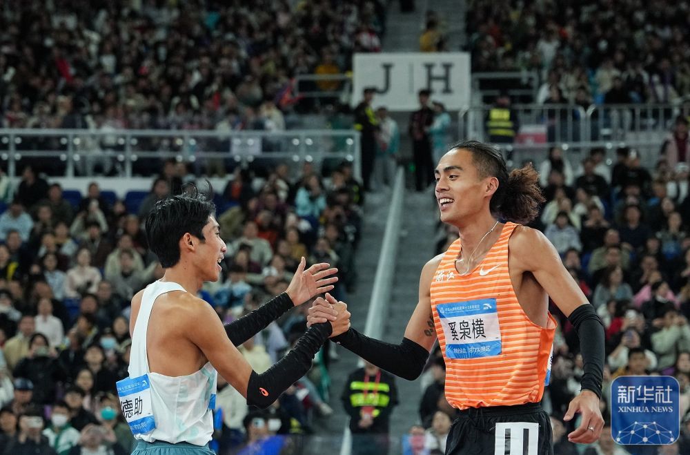 ↑ 广西队选手刘德助(右)和江苏队选手陶沛林在比赛中,德助夺他们最终分获冠、田径亚军。男米 新华社记者 周牧 摄
