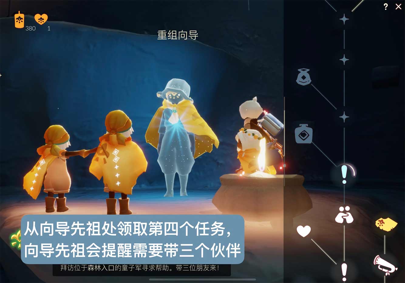2、集结季第飞上去接取第四个季节任务,光遇个任会提醒带三个伙伴一起去完成任务。