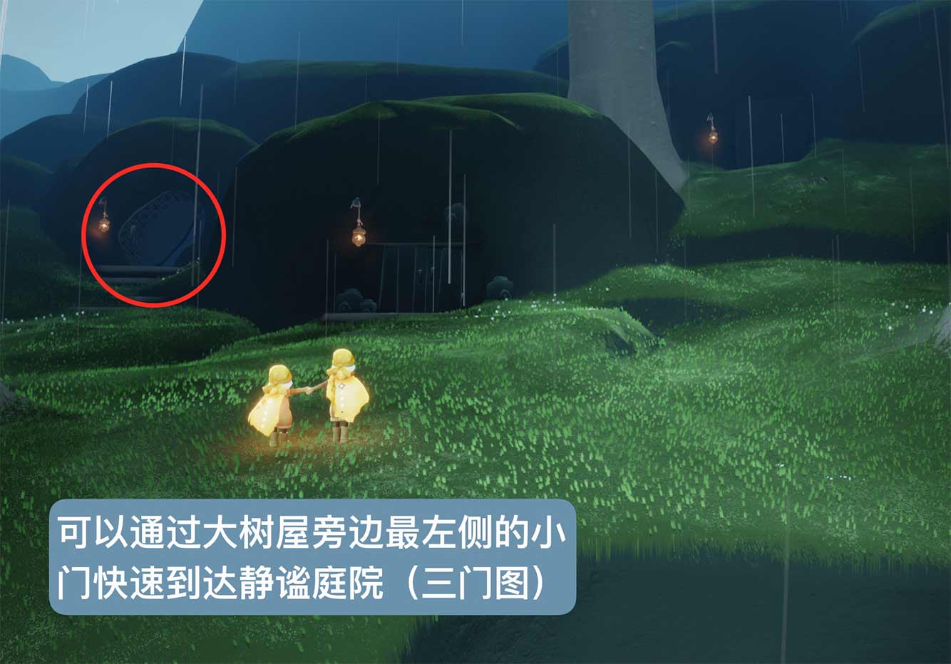 3、来到大树屋左边的山坡上,从第一扇门那里抄近路过去。