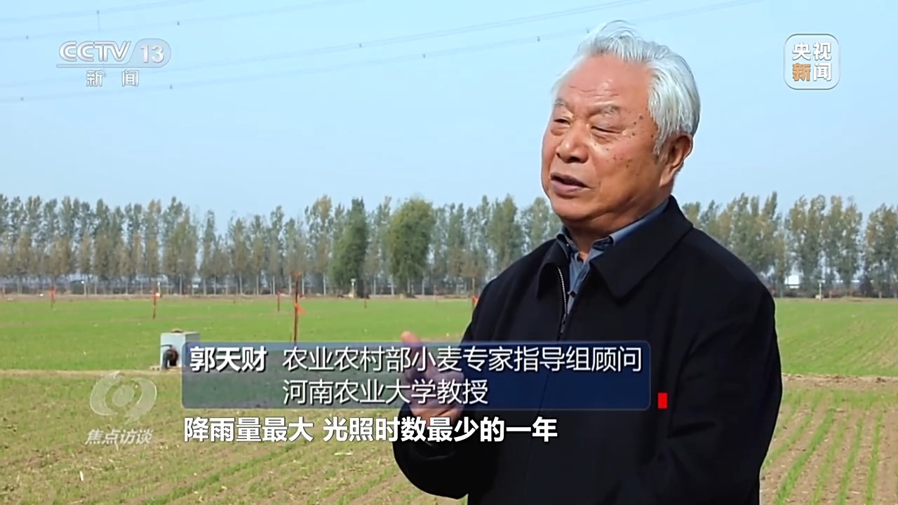 郭天财:小麦大面积晚播,但是雨水又补充了土壤墒情,河南有句农谚,地湿无晚麦,麦收隔年墒,麦种泥窝窝,来年吃馍馍。这就说明了底墒的重要性,根据我从事小麦研究50年的经验,哪一年的底墒好,第二年往往是丰收年。培育冬天壮苗,抓好春季和后期两个管理的关键时期,这样才能实现小麦的丰产高效。