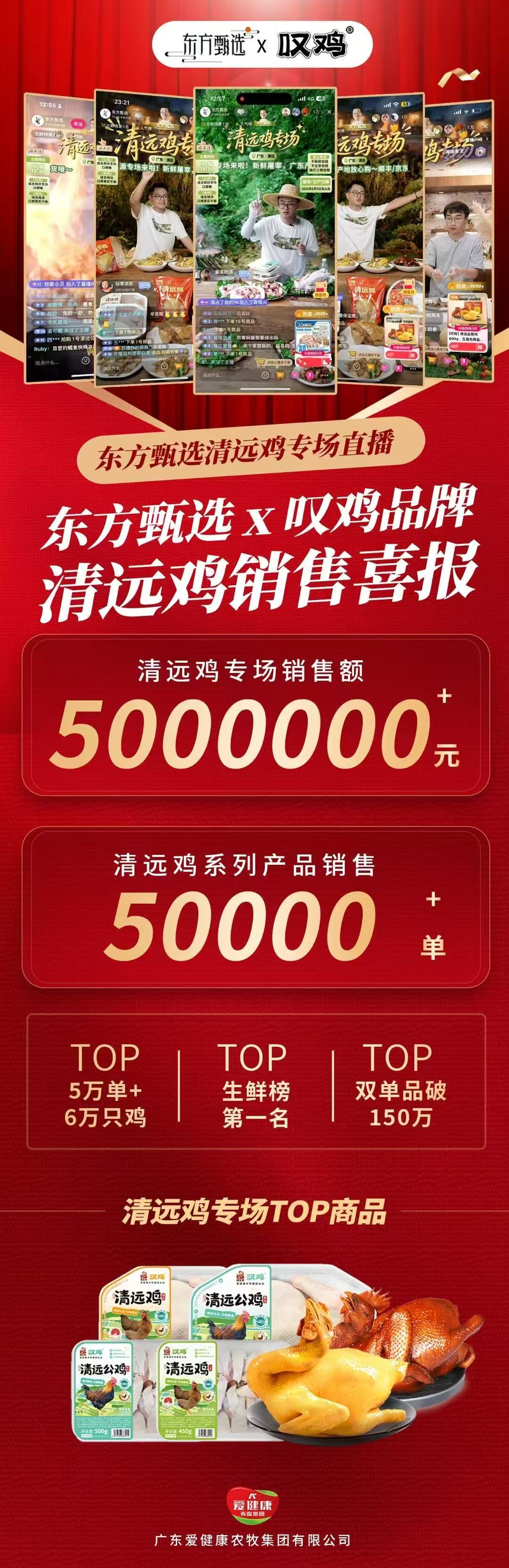 清远鸡销售喜报!记者从清远鸡头部企业广东爱健康农牧集团有限公司(下称“爱健康公司”)了解到,清远6月9日,鸡单该公司旗下品牌“叹鸡清远鸡”在东方甄选的日销专场直播中,销售额破500万,突破清远鸡系列产品销售5万+单、东方6万只鸡,甄选荣登生鲜榜top1!生鲜售额