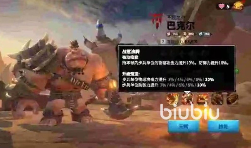 第2个技能是战意沸腾,属于被动类型,增加所率领的步兵兵种攻击力和防御属性,提升10%物理攻击力和10%防御力,升级之后还有加成。第3个技能同样是被动类型,战栗咆哮,在受到普通攻击时,有10%几率对目标部队施加消沉效果,降低其接下来4秒内的攻击力,每10秒钟最多触发一次。在升级技能之后,攻击力降低的效果最多能达到25%。