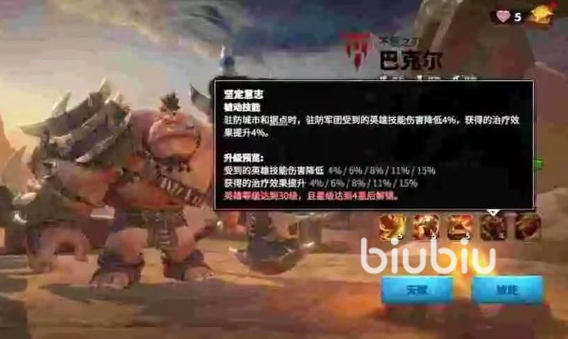 第4个技能坚定意志。当巴克尔作为驻防队长的时候,在城市和据点驻防,使驻防集团受到英雄技能伤害降低最多15%,获得治疗效果加成最多15%。对整体续航和靠爆发性伤害都是显著的提升。第5个是觉醒技能破釜沉舟,当所属部队血量降低到50%以下的时候,发动反击时有50%几率对目标部队施加流血效果,在接下来的三秒内对目标附加持续输出。