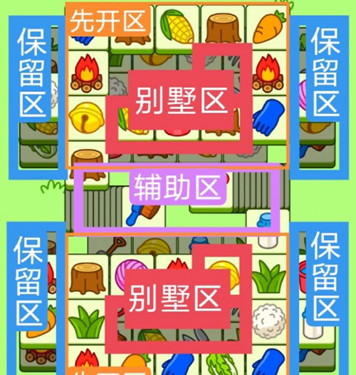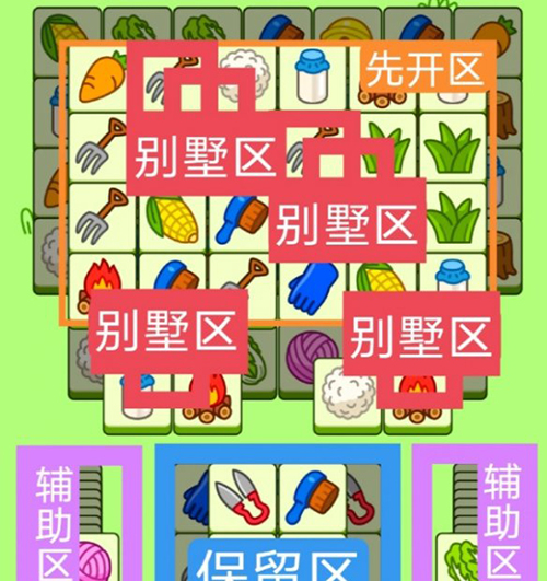 两个直角形大别墅,两个小三角形别墅,开局优先消除橙色区,然后按照一层层均匀消除表面牌的思路去进行消除, 哪里压牌比较多就先消除哪里,必要时可以用盲盒区辅助消除表面牌。尽量还是以别墅区内互相消除为主。蓝色区有叠牌,但是不多,可以全部保留到后期使用。