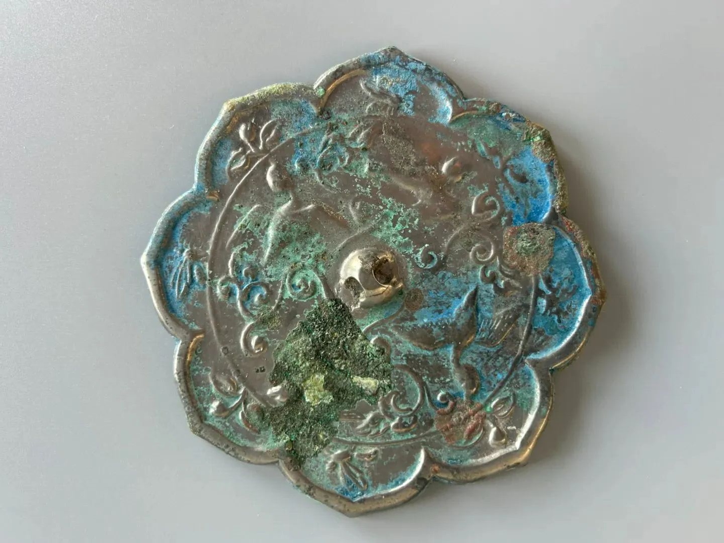铜镜呈八瓣菱花形,内切圆形,圆纽,纽周边饰鸟纹与花枝纹,缘内蜜蜂、花叶相间排列;铜簪呈“U”形,由一根铜丝弯折而成,簪体的横截面为圆形;铜指环保存较好,部分有锈蚀,圆环状,横截面近圆形,素面;铜戒指保存较差,锈蚀较严重,圈底一侧已经残损,戒面较宽、有1.2厘米,径长约1.7厘米。