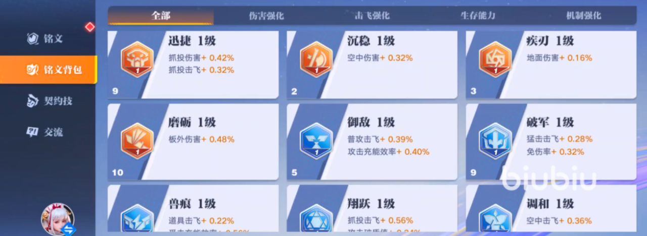 契约底下还有铭文系统,相当于王者荣耀系统里面的铭文装备,但是最大不同点在于,星之破晓的铭文分为玩家对战与刷图pve两部分,在对战上就是加成各种的特殊效果,在刷图上就是增加基础属性,面板及四维属性:物理魔法攻击、防御、血量。