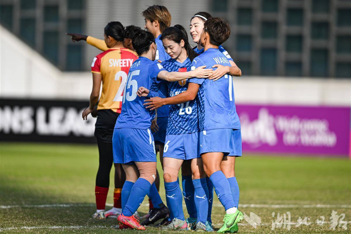 11月20日,汉女王霜进球后与队友庆祝。女足(湖北日报全媒记者 任勇 摄)