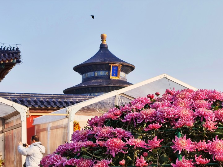 天坛公园园艺工作者介绍,为呈现最佳效果,团队提前一年筹备,在大立菊栽培中改良支架技术,让花型更匀称。本次菊展将持续至11月9日。