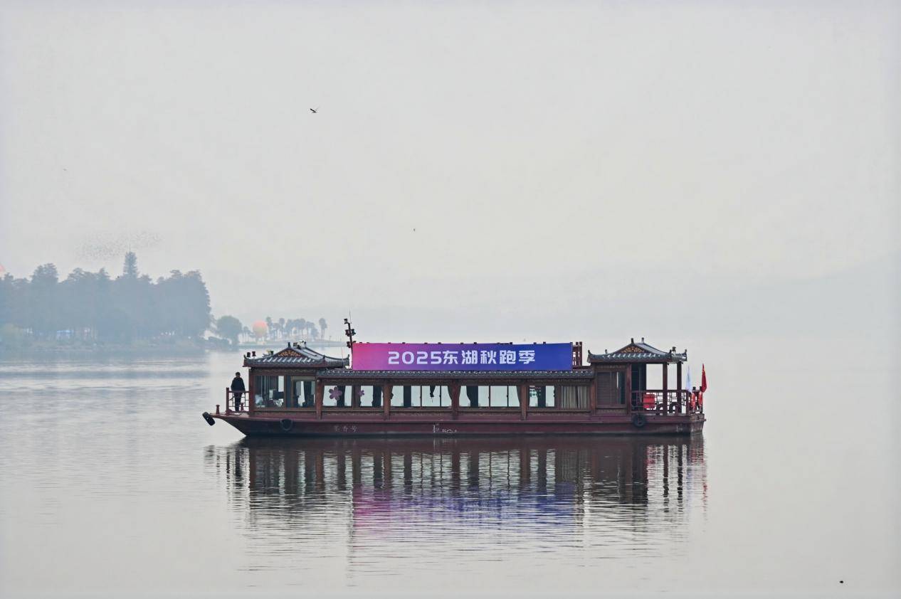 本次10公里赛道经过精心设计,巧妙串联起湖光序曲、多九女墩等多处东湖美景。途中,东湖九女墩水域还惊喜亮相一支“水上啦啦队”——九艘特色船只静泊碧波,既有古韵悠然的东湖游船,也有优雅的帆船,还有科技感十足的智能游船,与岸上奔跑的丽人相映成趣,构成一幅动感与诗意交融的画卷。