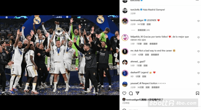 完美谢幕!克罗斯社媒晒球队捧杯合影:Hala Madrid,一如既往!