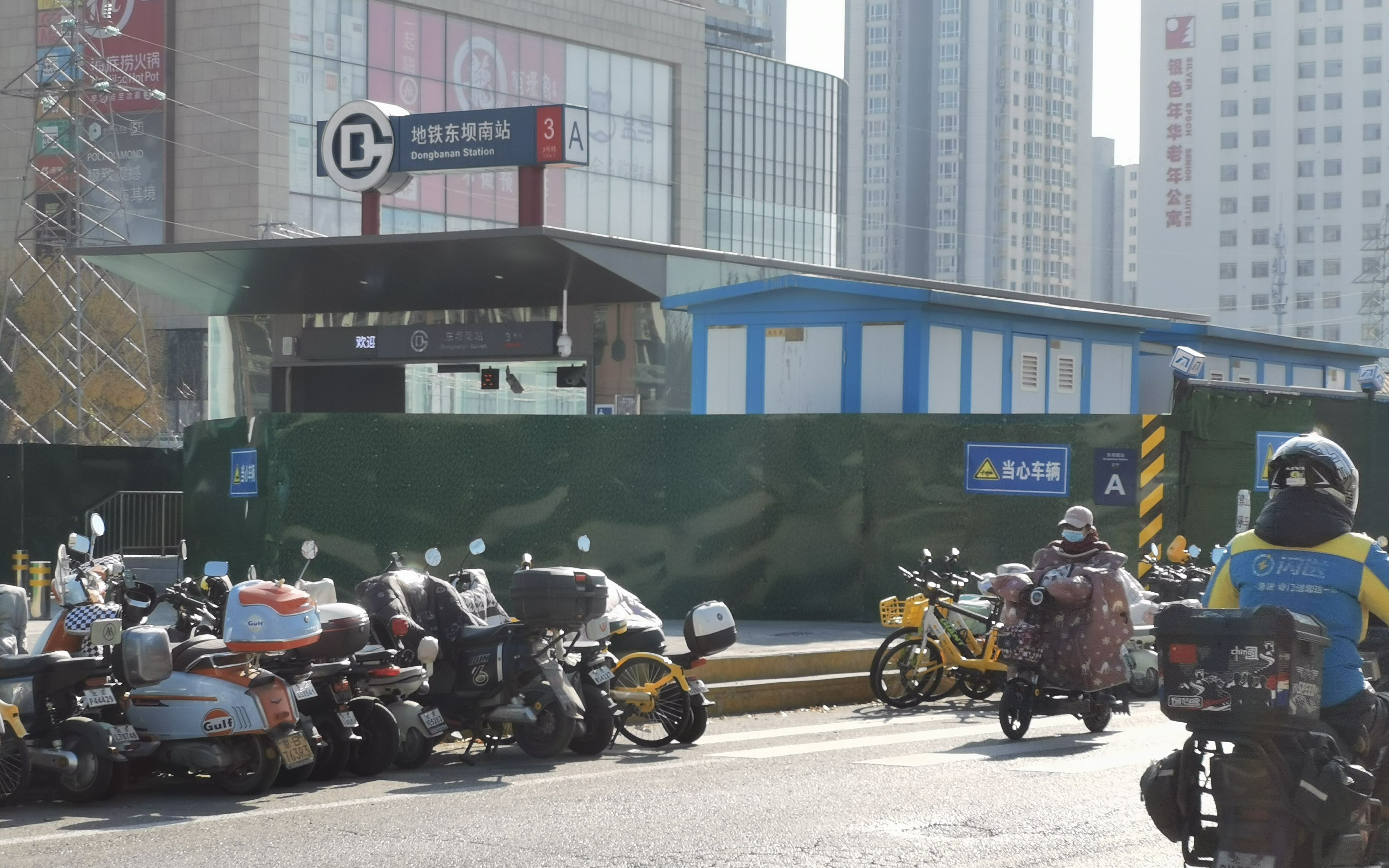 从张先生吐槽的东坝南站地铁A口一出来,就能见到附近全是工地,绿色的围挡几乎将出口裹了起来。西侧的开口则通向一条南北向的马路,马路不宽,大概仅能容纳来往各一辆机动车同时通行。由于街面不宽,车道线内停满了共享自行车、电动车,行人只能和机动车混行一处。
