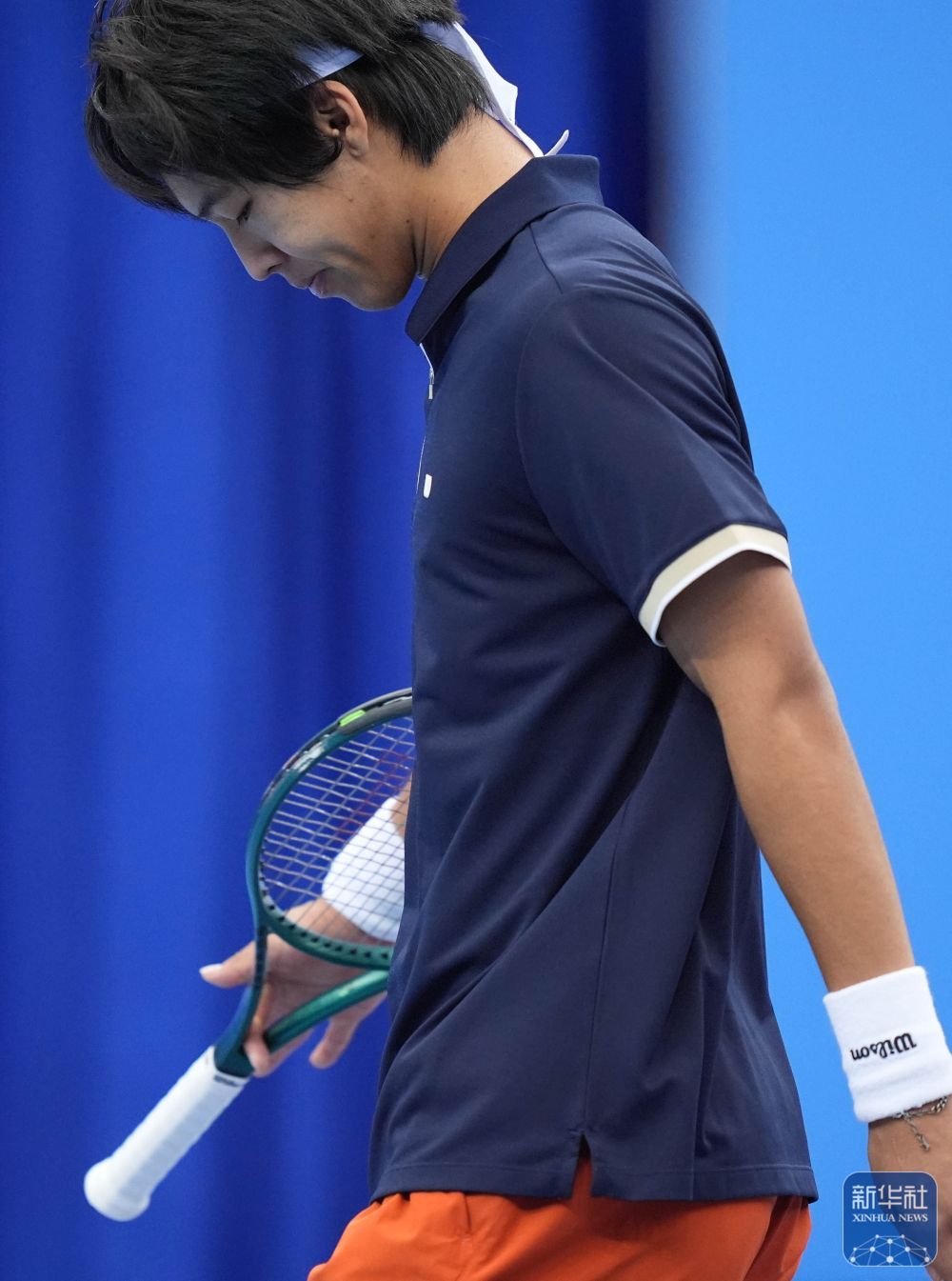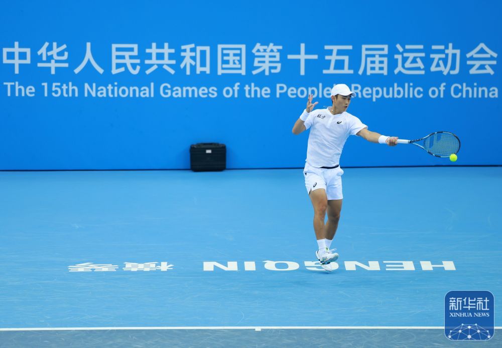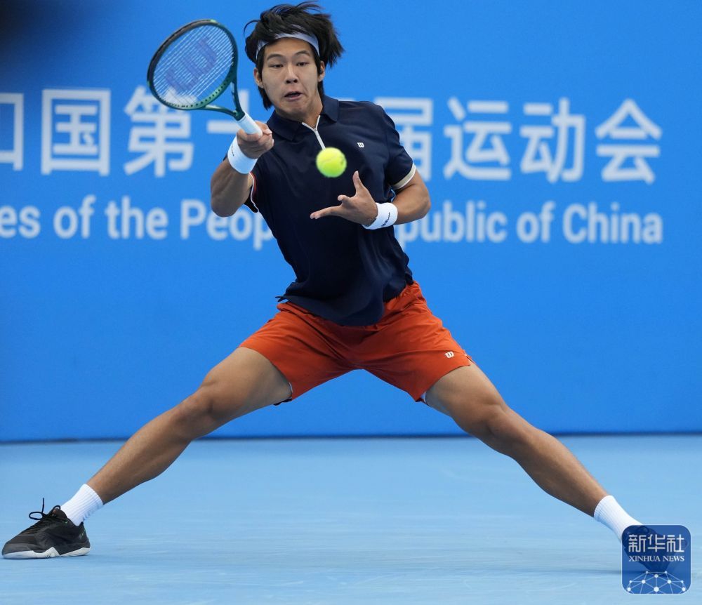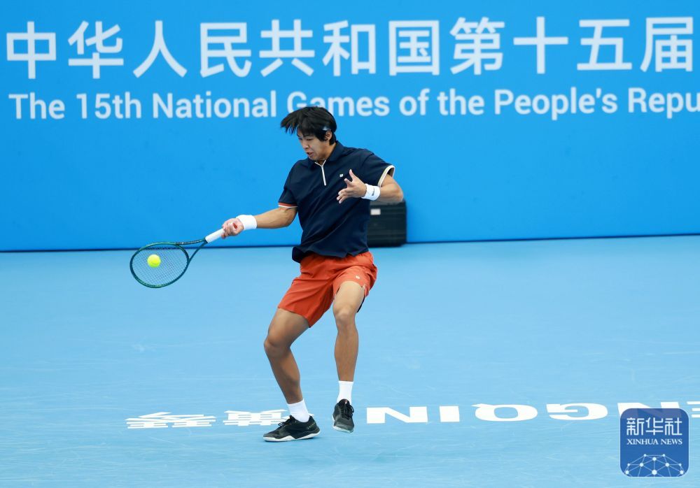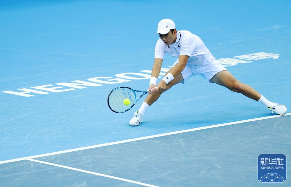 ↑ 北京队选手商竣程在比赛中回球。网球新华社记者 张晨霖 摄