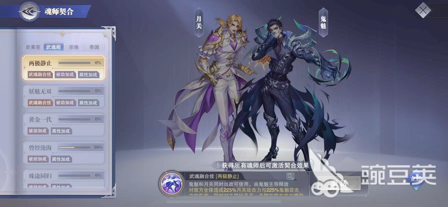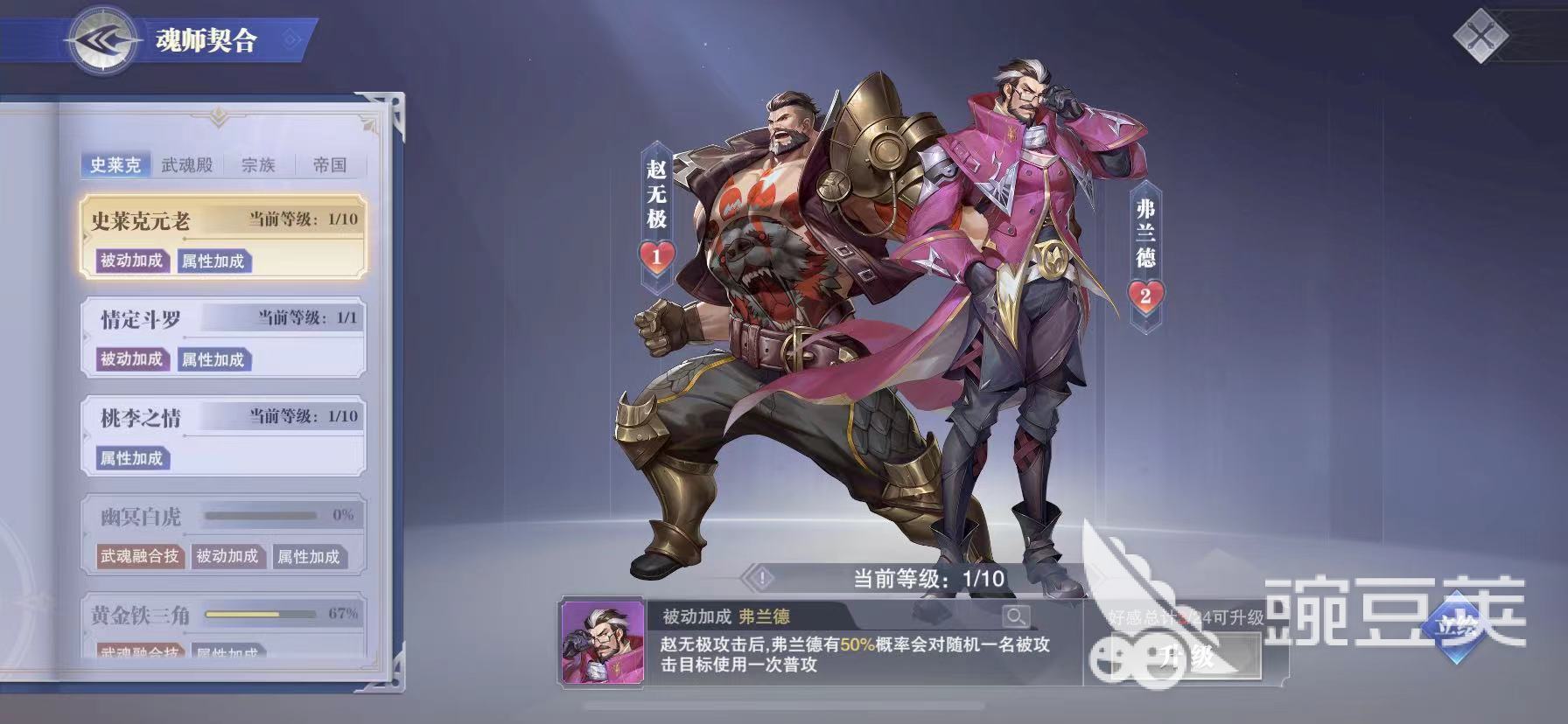 至于契合度的升级方法也是根据玩家与魂师的好感度决定,两位魂师的好感值总计达到一定标准时可进行升级,最高等级为10级,最高加成为100%,武魂融合技不需要手动去使用,只要两名魂师同时上场就可自动触发。
