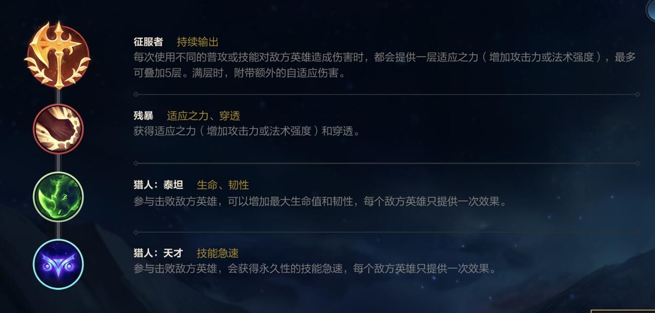 1、游赵赵信符文推荐一:征服者+残暴+猎人泰坦+猎人天才