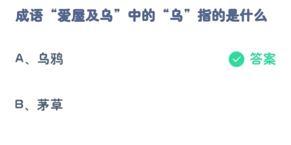 支付宝蚂蚁庄园小课2月23日的蚂蚁其中一个问题是:成语爱屋及乌中的乌指的是什么?这道题考查的是关于成语爱屋及乌方面的知识,下面一起来看一下蚂蚁庄园2月23日的庄园中正确答案吧。