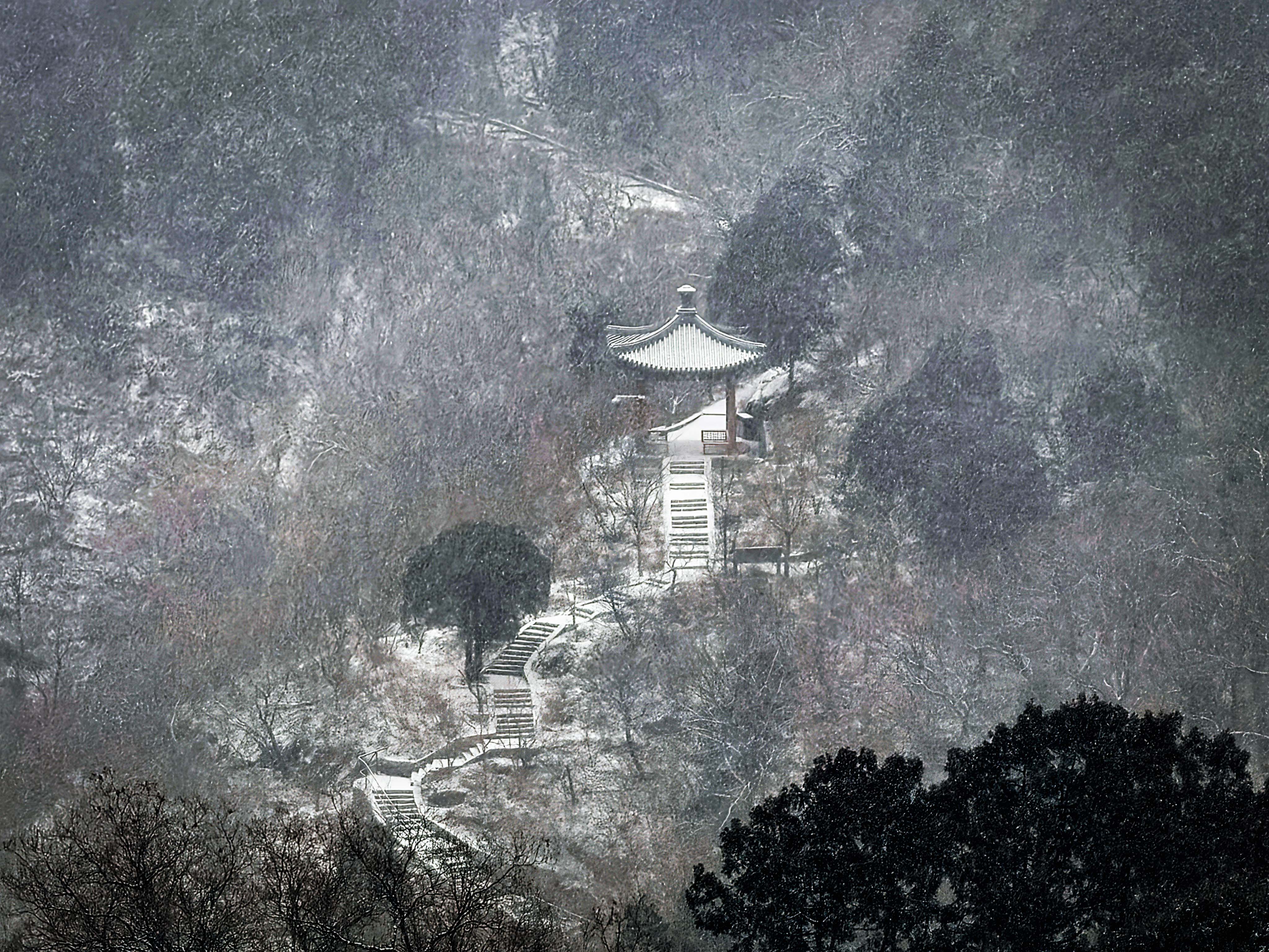 国家植物园卧佛寺中,色彩浓郁的红墙和簌簌落下的白雪形成强烈的色彩碰撞,鹅黄色的蜡梅傲雪绽放。香山公园中,山林寂静,林间小径被皑皑白雪覆盖,有一种隔绝尘世的美感。陶然亭公园,残荷成了皑皑白雪中的一抹亮色,和远处的吹台亭相映成趣。