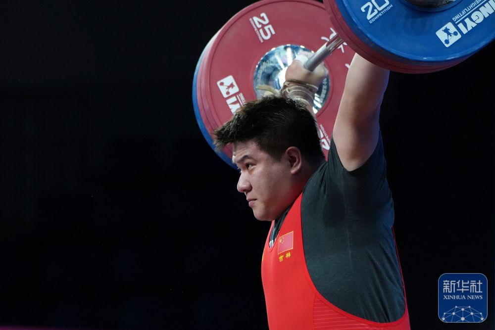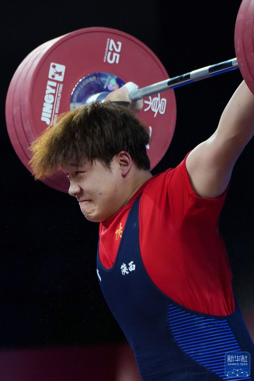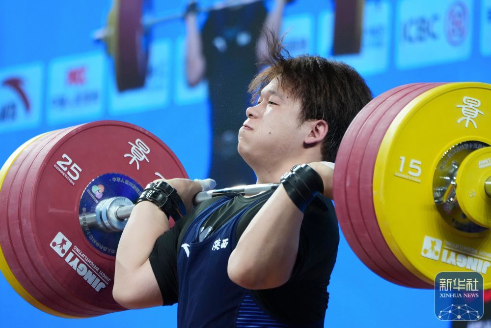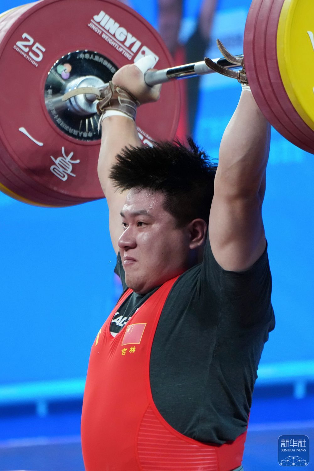 ↑ 吉林队选手任相霖在抓举比赛中。举重斤级