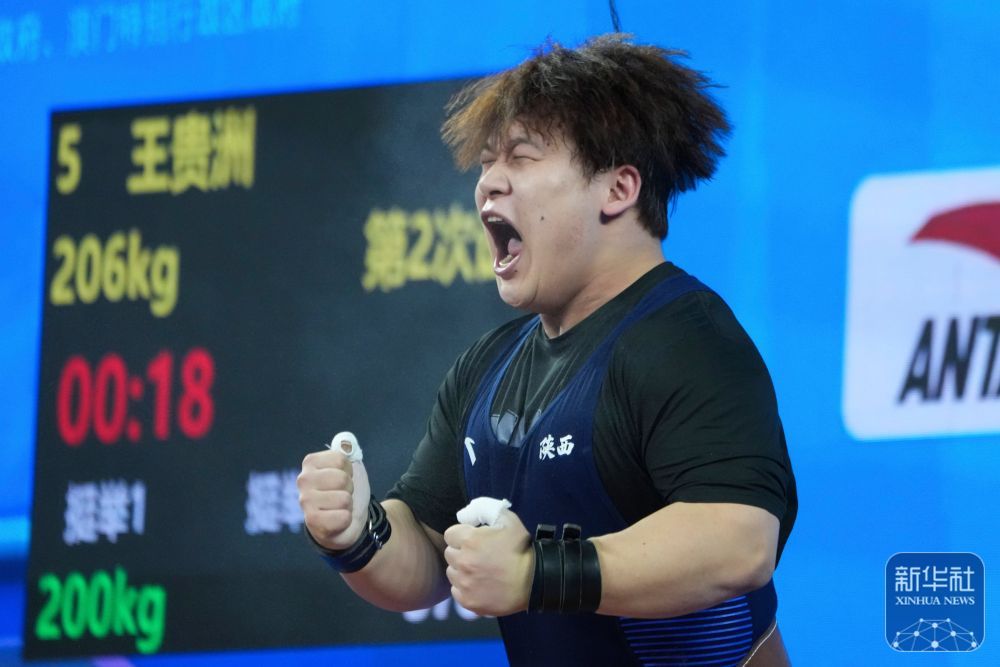 ↑ 陕西队选手王贵洲在挺举比赛中试举成功后庆祝。贵洲冠军